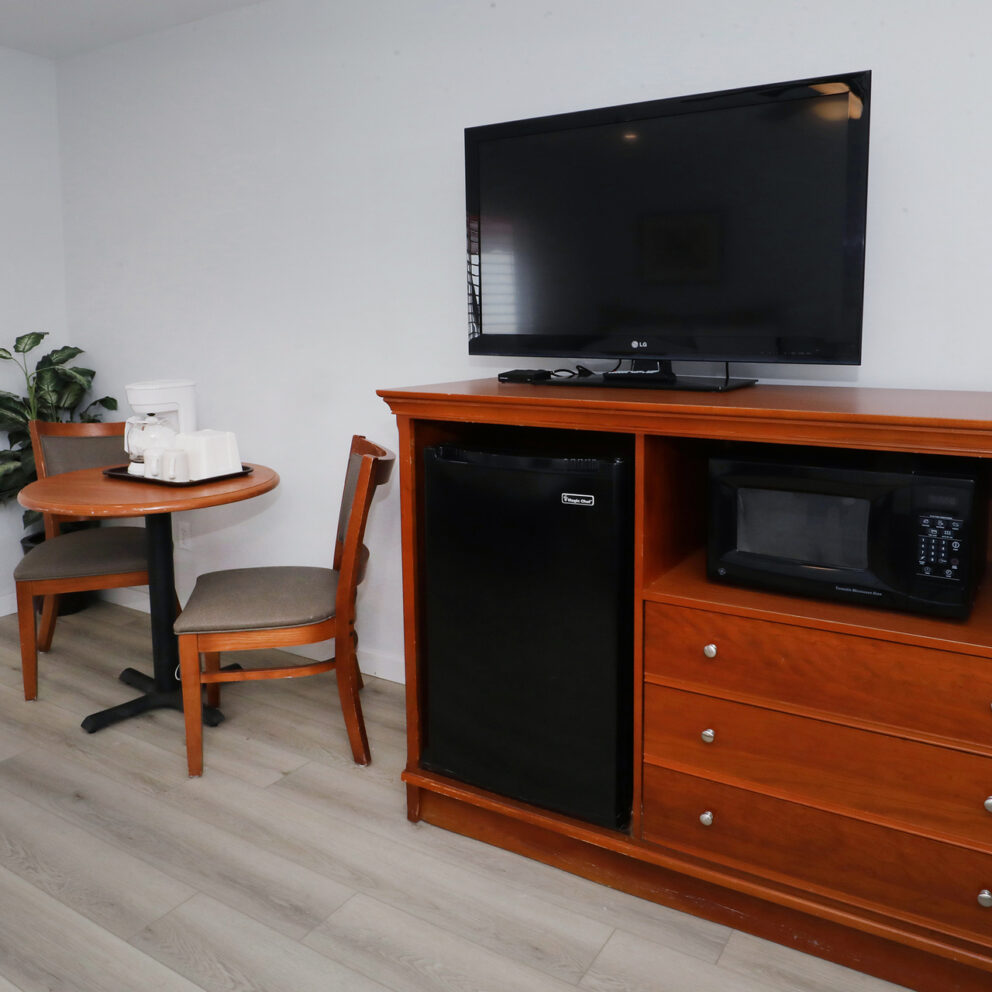 - Amenities: drip coffee maker (coffee NOT included), flat-screen TV with satellite, free wi-fi, hairdryer, in-room safe, iron & ironing board, microwave, mini-fridge, wall air-conditioning
